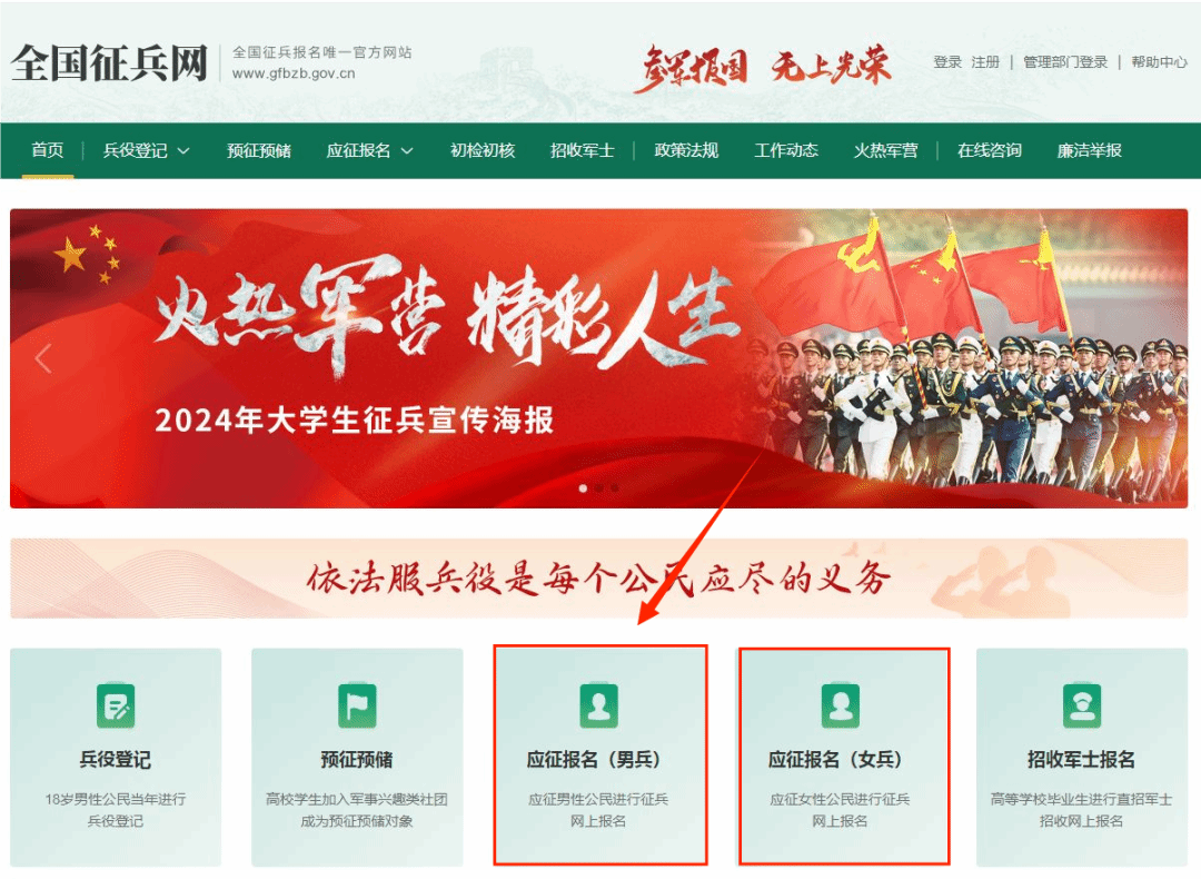会出现以下界面,点击“应征报名(男兵)”或“应征报名(女兵)”,进行跳转;