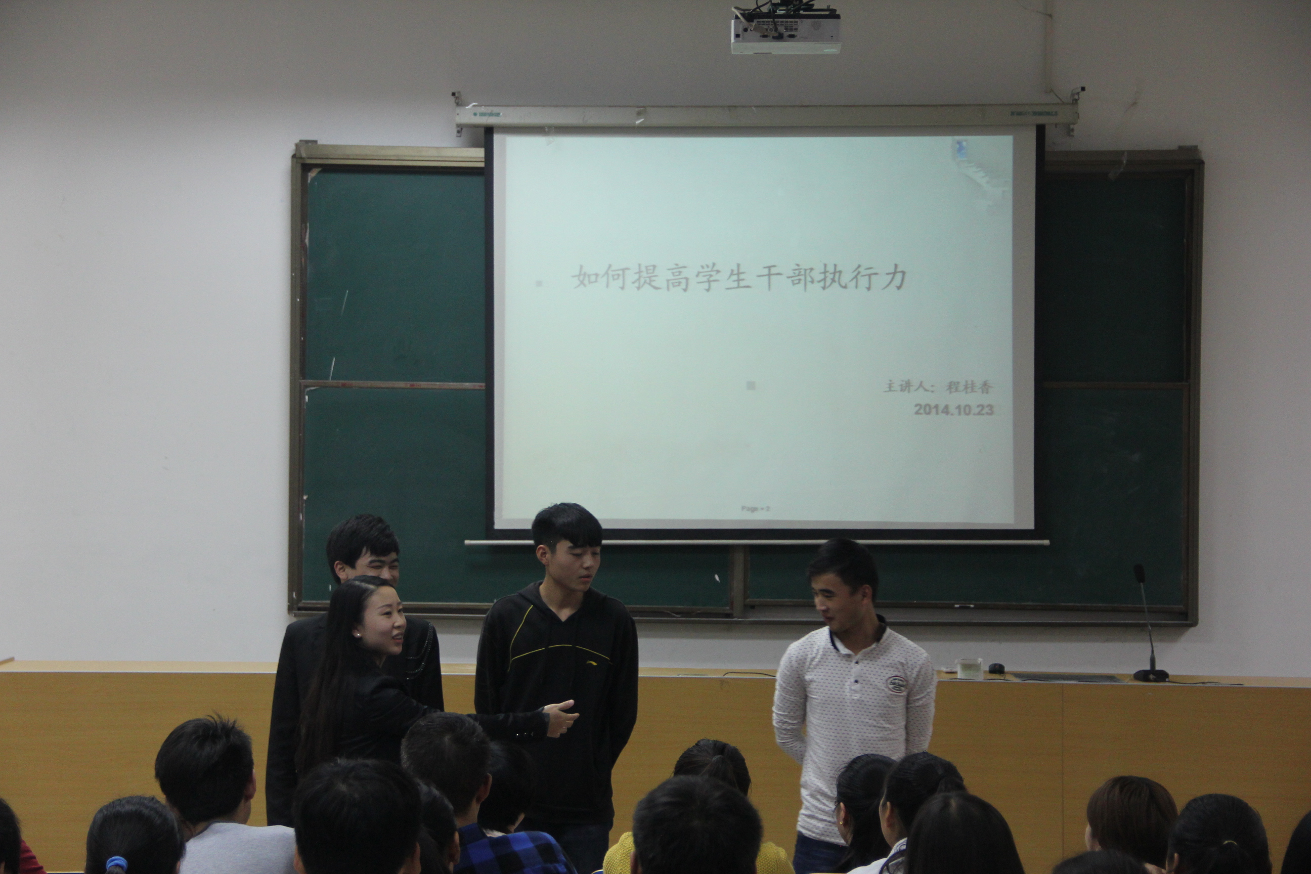 三位老师分别就如何提高学生干部执行力、应用文写作及大学生常见的心理健康问题三个方面进行指导,学生干部要摆正自己的心态,高效高质的完成本职工作,宣传工作者一定要注意写作要求注意事项,对于心理健康的问题孙颜老师强调作为学生干部要时刻关注学生日常表现如发现异常要立刻上报。
