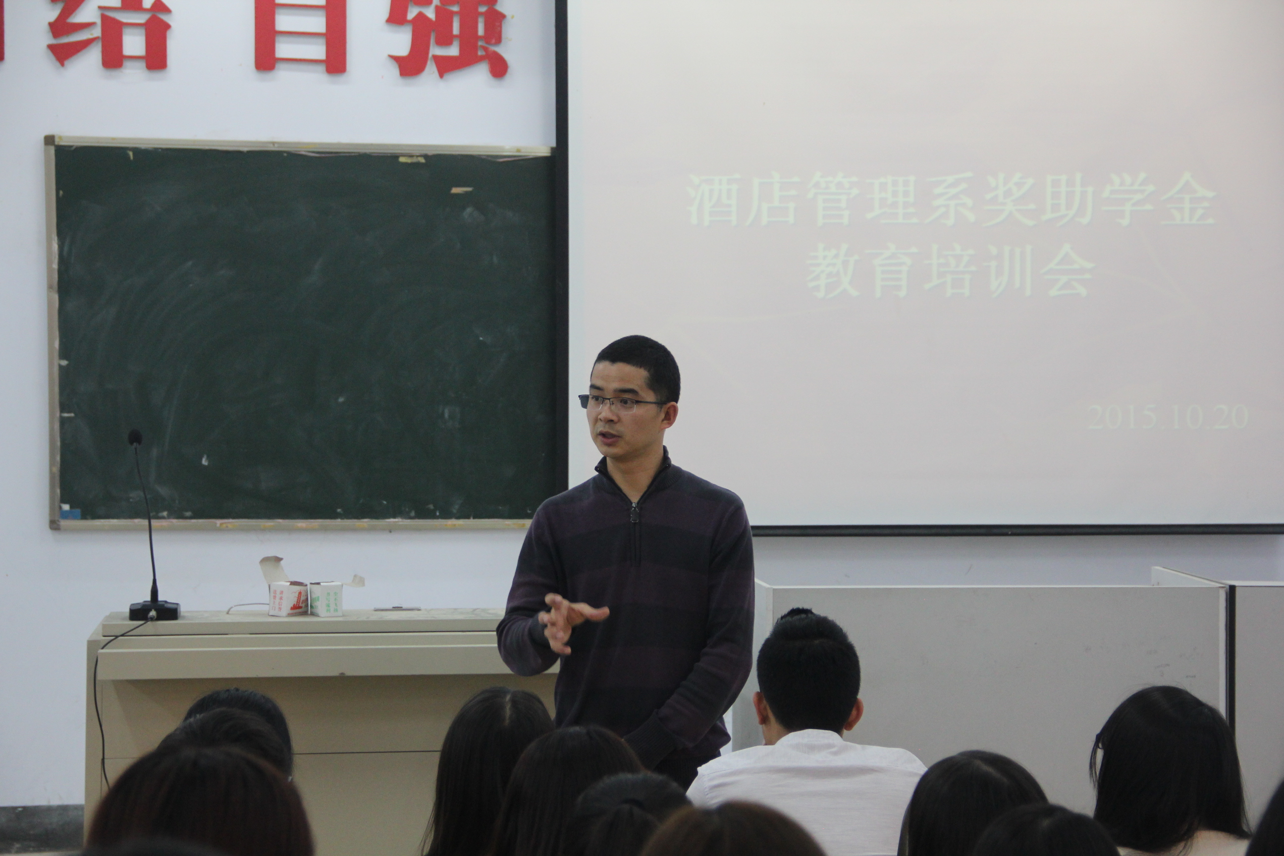 2015年10月20日16时,酒店管理系在校史馆一楼报告厅召开了奖助学金教育培训大会。出席本次会议的有酒店管理系党总支副书记陈海彬、团总支书记侯宁波以及辅导员高静。酒店管理系奖助学金待评定者参与了此次会议。