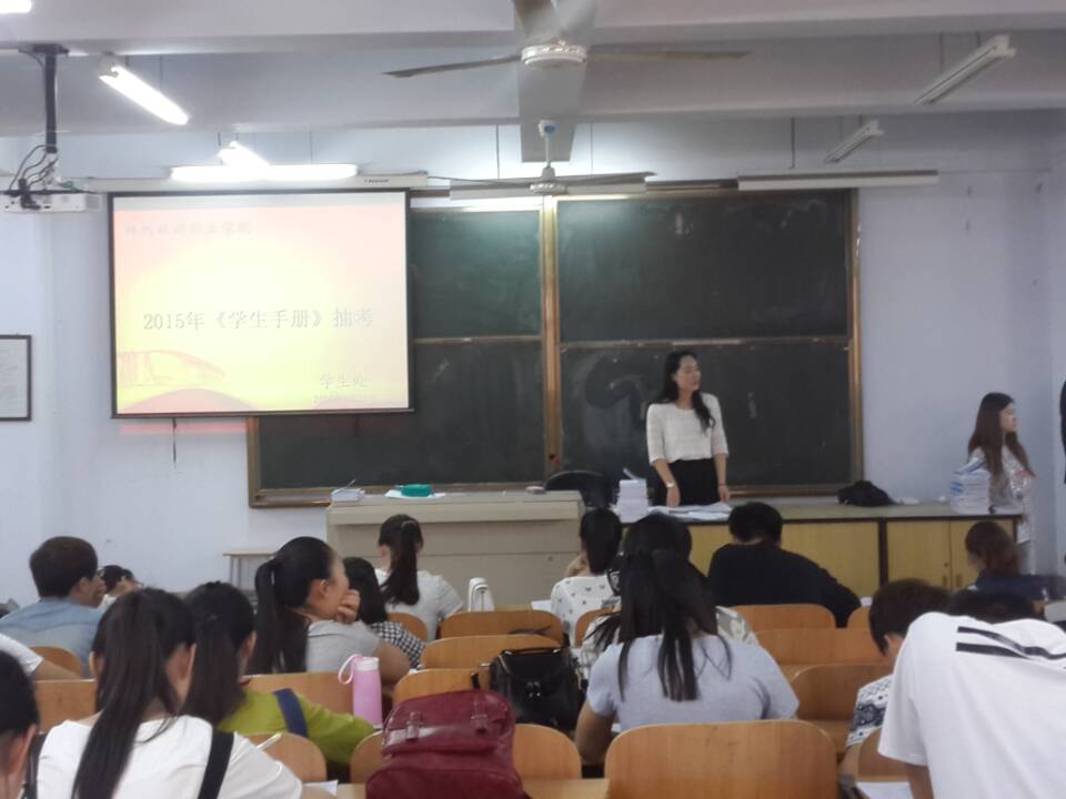为增强学生的纪律意识,培养其良好的生活作风,配合学生处强化学生的自我管理意识,2015年5月21日下午16:30酒店管理系于东教学楼二楼南阶举行《学生手册》抽考活动,被抽考学生是学号尾号为3或8的同学, 学生处余高峰老师和程婕老师负责监考。