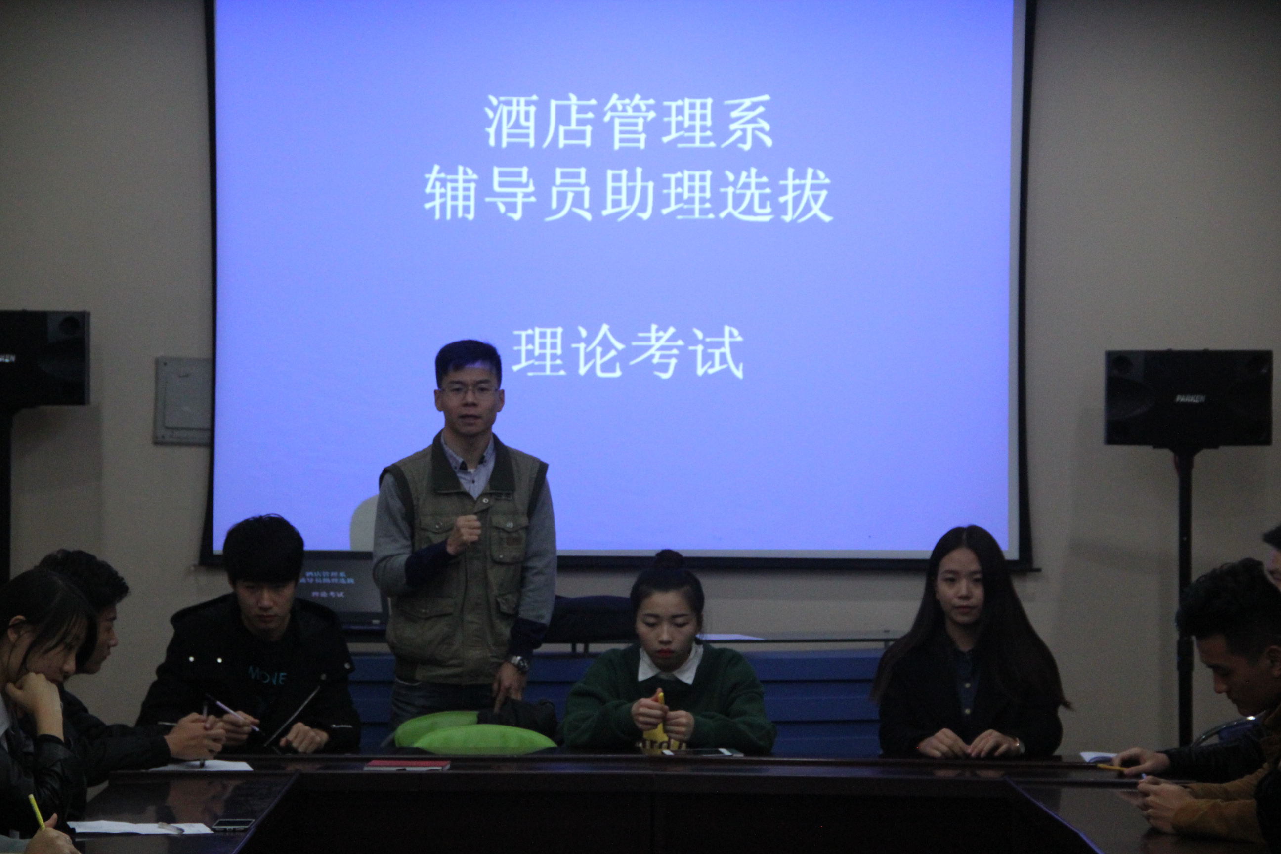 为培养辅导员助理,更高效的帮助解决酒店管理系新生各方面问题,酒店管理系于2016年10月27日在实训楼3楼水晶房公开选拔。参与本次选拔的主要为15级学生,此次选拔监考老师由辅导员牛亚飞担任。