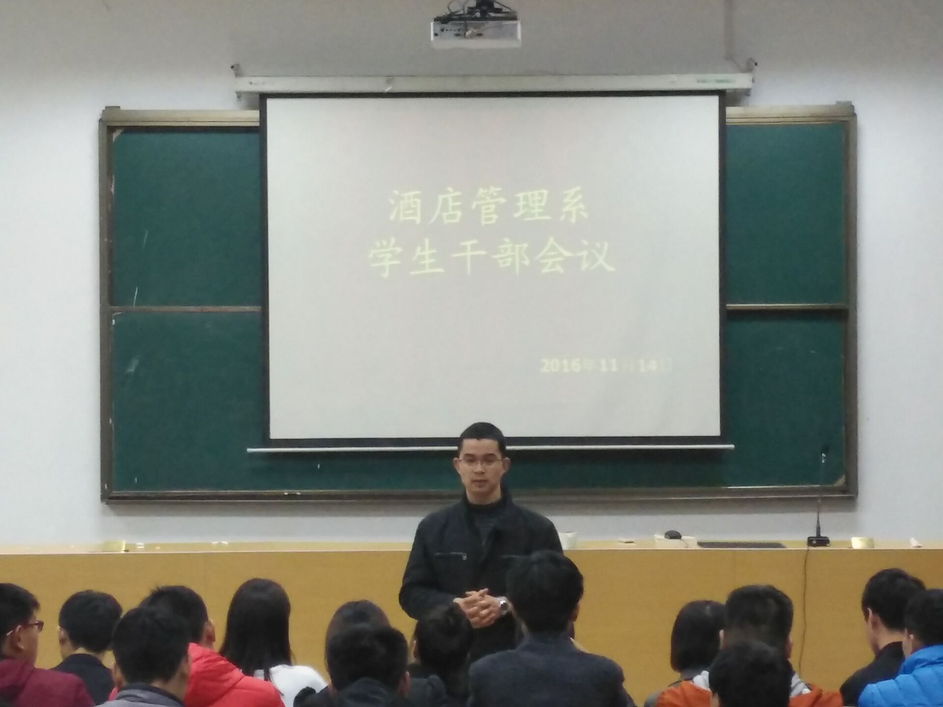 2016年11月14日下午,酒店管理系在实训楼一楼报告厅召开了学生干部会议,出席此次例会的有党总支副书记陈海彬、团总支书记侯宁波以及全体学生干部。 陈书记首先公布了辅导员助理选拔结果,进一步明确辅导员助理一职的重要性。其次,针对校园安全问题发表讲话,提出要端正思想,自觉维护校园安全。并针对学生考勤问题提出相关要求,杜绝学生干部徇私舞弊。最后由学生干部对上周的纪律卫生情况做出汇报,并部署了学生干部的本周工作。 本次会议,增强了学生干部责任意识,规范学生干部工作作风,进一步推动酒店管理系更好、更快的发展。