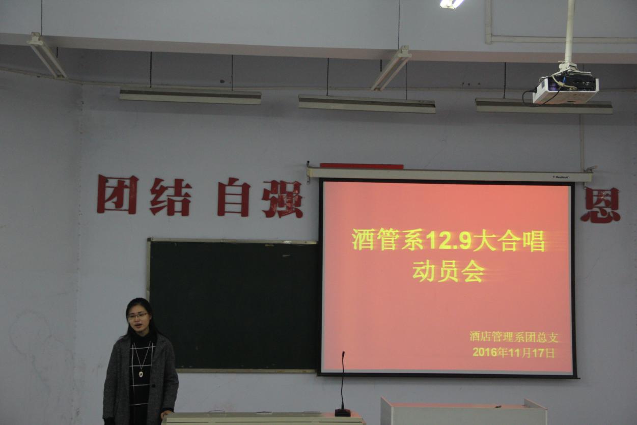2016年11月17日,酒店管理系于校史馆报告厅开展12·9大合唱动员大会。酒店管理系党总支副书记陈海彬书记、辅导员张雨微老师以及部分学生干部和全体合唱选手参与此次会议。