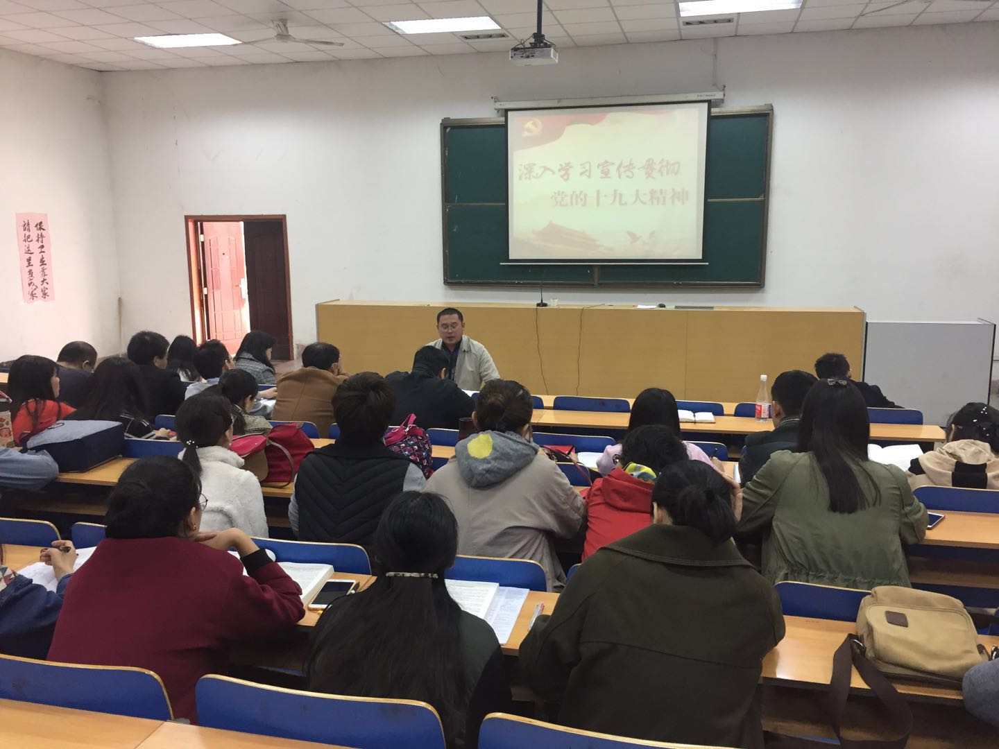 2017年11月9日中午1点实训楼一楼东报告厅,经济贸易系系召开全系教师大会,集中学习党的十九大习近平总书记报告。