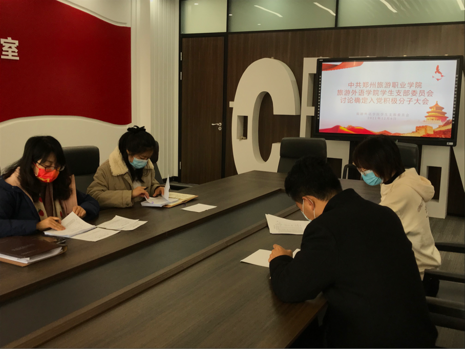 12月6日12:30,旅游外语学院学生党支部于4B教学楼党员活动室召开2021年度讨论确定入党积极分子大会。大会由学生党支部书记务婧博主持。