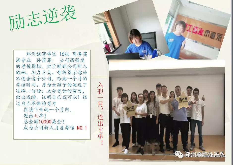 王凤丽——2017级商务英语专业毕业生,在校期间荣获河南省首届大学生英语单词大赛专科组二等奖,目前在昂立国际教育工作,并被评为“最具潜力教师”。