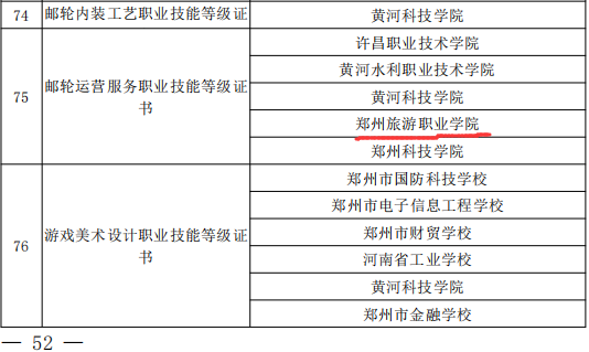 2020年5月12日,河南省1+X证书制度试点工作协调推进办公室函件(推进办〔2020〕2号)发布通知,正式公布河南省第三批1+X证书制度试点院校名单。旅游外语学院获批邮轮运营服务职业技能等级证书(初级)培训、认证试点。
