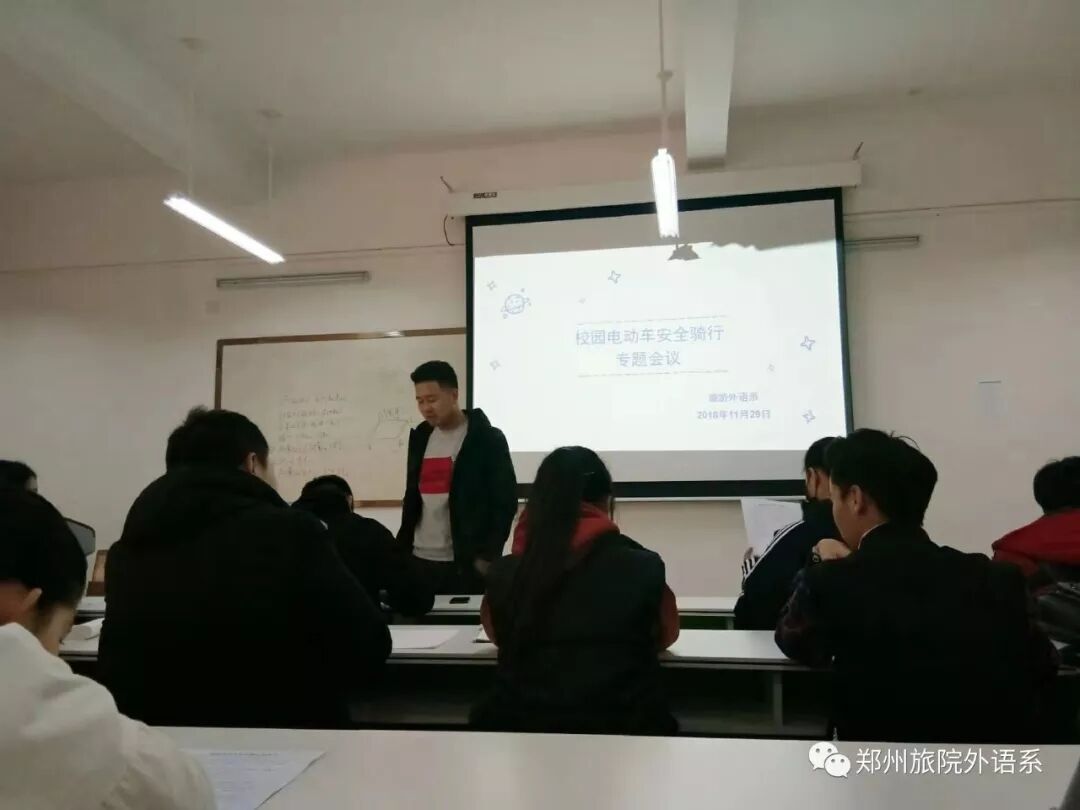 为提高同学们校园交通安全防范意识,确保驾乘人员的行车安全,11月29日下午我系在4B教学楼307教室开展了主题为“校园电动车安全骑行”专题会议。沈晋旭老师和各班安全委员参加了此次会议。