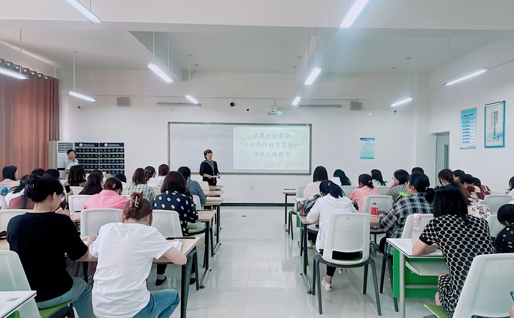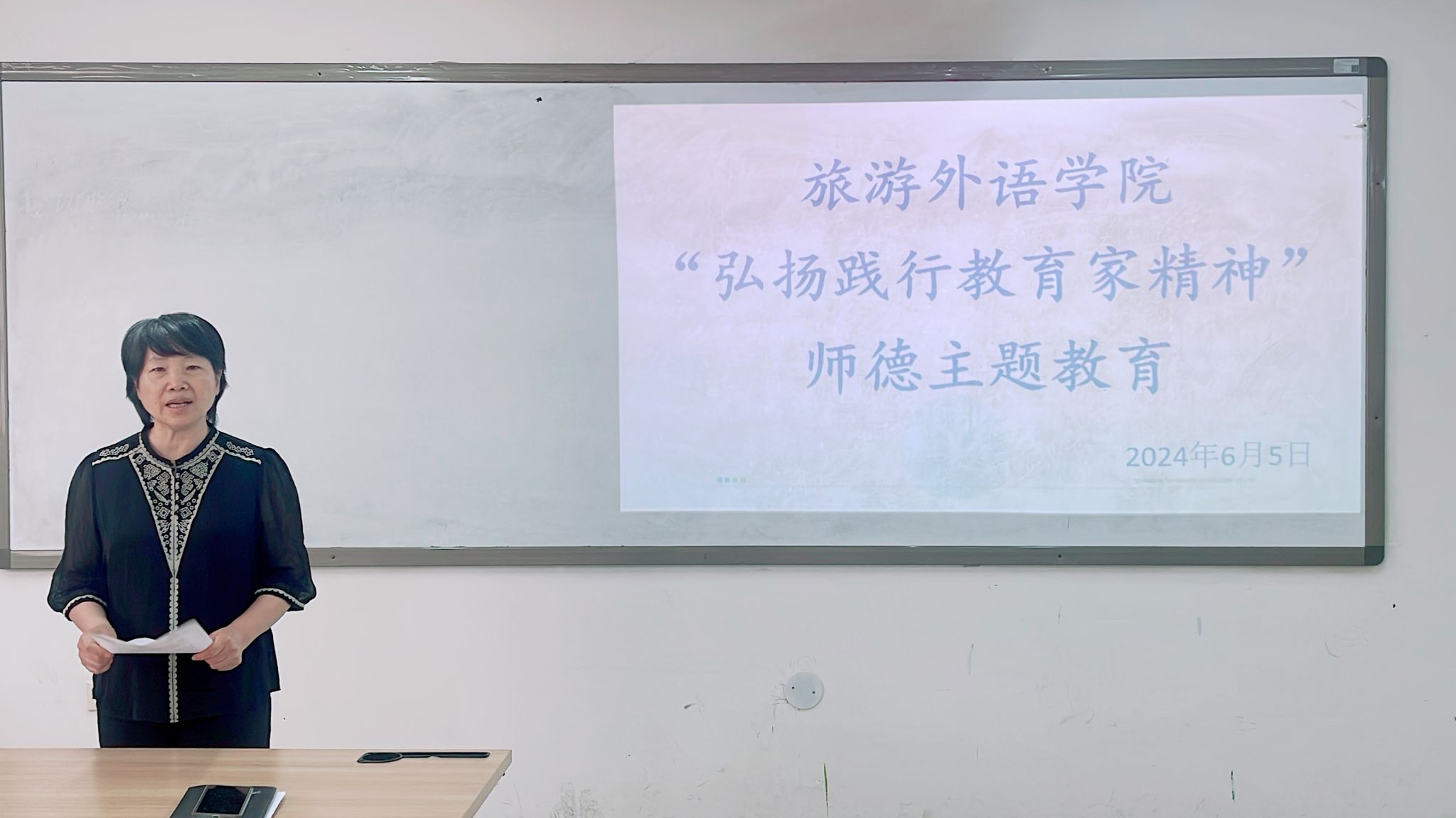6月5日,旅游外语学院在清源楼207教室组织开展“弘扬践行教育家精神”师德主题教育,活动由旅游外语学院院长张贺玲主持,全体教职工参加。