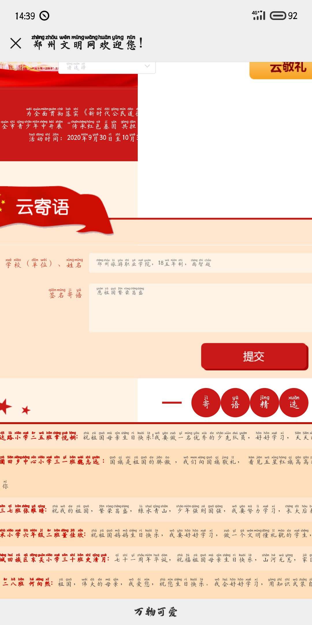 通过奏唱爱国歌曲,组织观影活动,和网上扫祭等方式,我院活动从始至终贯穿着爱国情怀、民族精神,使学生们了解到了中国人身上的那种百折不挠、不畏强暴、尽忠职守、舍己为人的高贵品质。大家都感叹祖国的伟大。