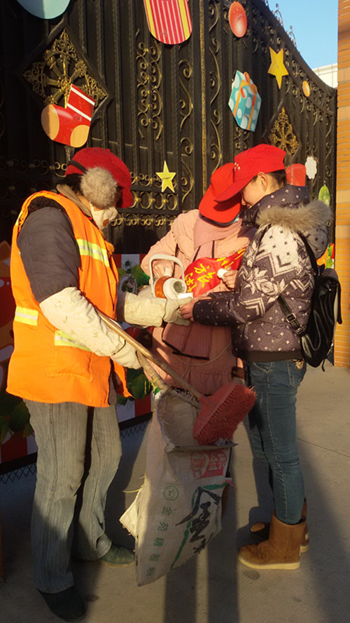 是他们,用一把把扫帚清洁出条条整洁的街道;是他们,用一辆辆三轮助推我们这座城市的文明。2014年12月16日16时,社会服务系团总支干事走出校园展开了关爱环卫工的活动。为他们提供一杯热开水,滋润他们干涸的嘴唇;用发自内心的笑容,去赞美他们的劳动,温暖那颗朴素善良的心!爱,不需要更多的语言,从自我做起,从小事做起,尊重环卫工人的劳动,共同维护城市的整洁,这才是最让他们开心的。