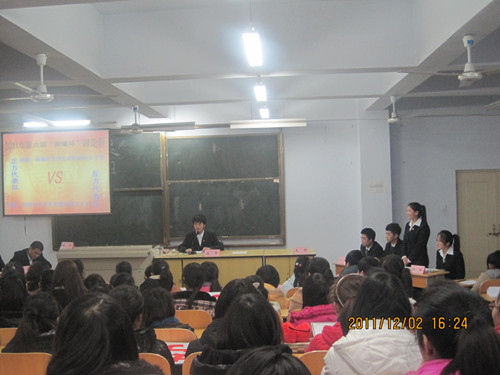 2011年12月2日下午四点,第六届“晨曦杯”辩论赛第十场在东教学楼二楼北阶梯教室拉开战幕。此次比赛由史海菊、侯春慧等老师担任评委。