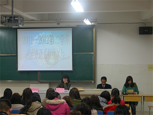 2012年2月23日晚,旅游外语系社团大会在西教学楼201多媒体教室隆重举行,旅游外语系党支部副书记许向蒲老师、团总支书记岳正阳老师出席了本次会议。