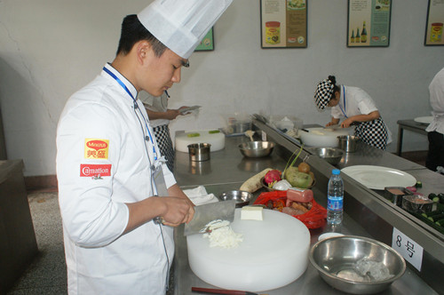 冷拼考验的是刀工,而刀工是厨艺至关重要的环节。参赛选手们各个聚精会神,“切”有细如发丝,“片”有薄若轻纱,动作干脆漂亮。同时参加面点比赛的选手们听着比赛的一声令下,他们立刻进入比赛状态,起酥油、和面、擀面等。只见他们都有条不紊的进行着自己的“工作”,一双如同魔术师的手,面团在他们的手中是那样的灵活自如,造型别致,丰富多彩。
