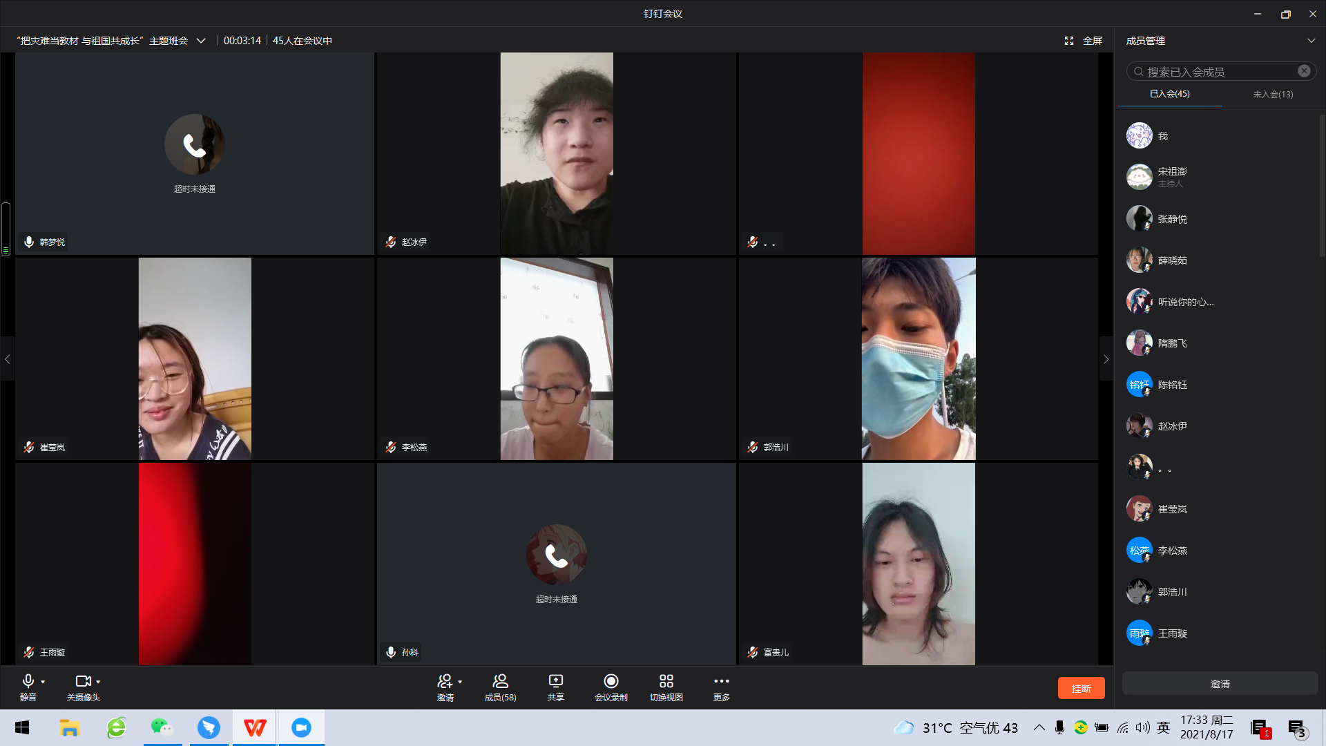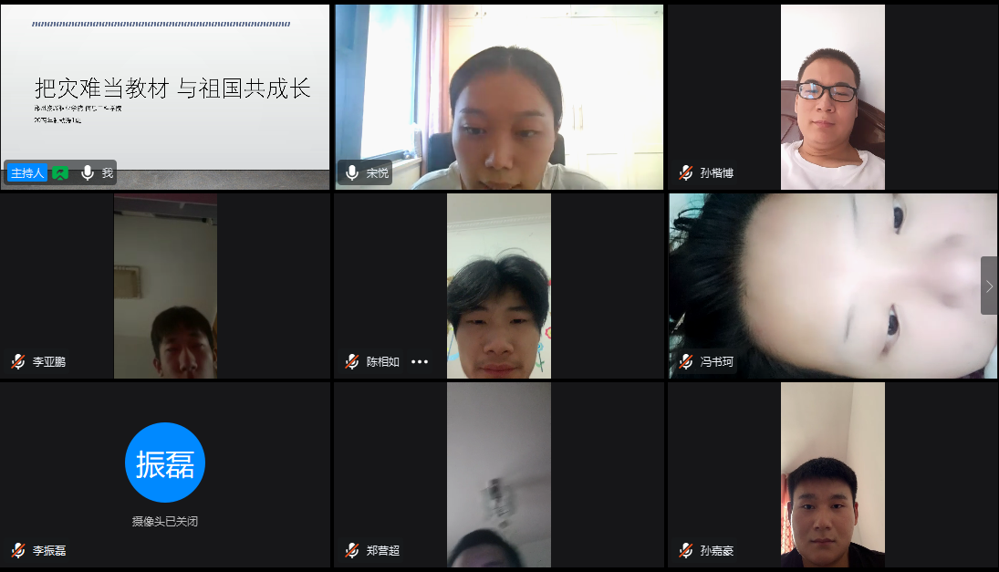 根据学校党委关于灾后重建和疫情防控工作部署,进一步激发我院师生的责任担当,引导师生把灾难当教材、把困难当磨砺,做到在灾难面前与国家共患难、与人民共进步,共同完成这场生命教育、信念教育、科学教育与道德教育,大力加强爱国主义教育,努力把防汛救灾工作、疫情危机转化为教育契机。信息工程学院于8月16-18日组织各班召开线上“把灾难当教材、与祖国共成长”主题班会。