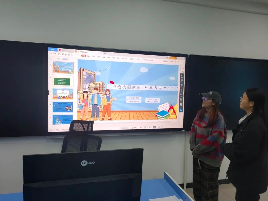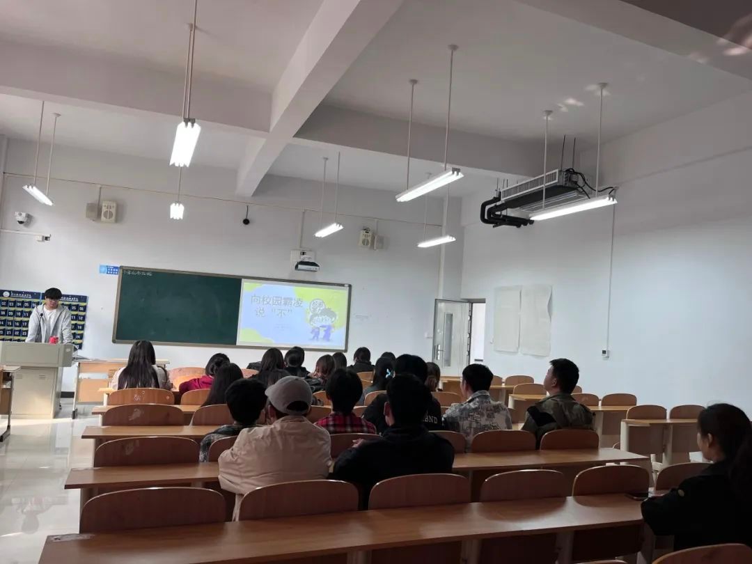 为加强校园安全管理,营造一个健康、和谐、成长的环境,进一步增强学生的法治观念和防范意识。文化艺术学院开展“拒绝校园欺凌,对暴力说“不””主题班会。