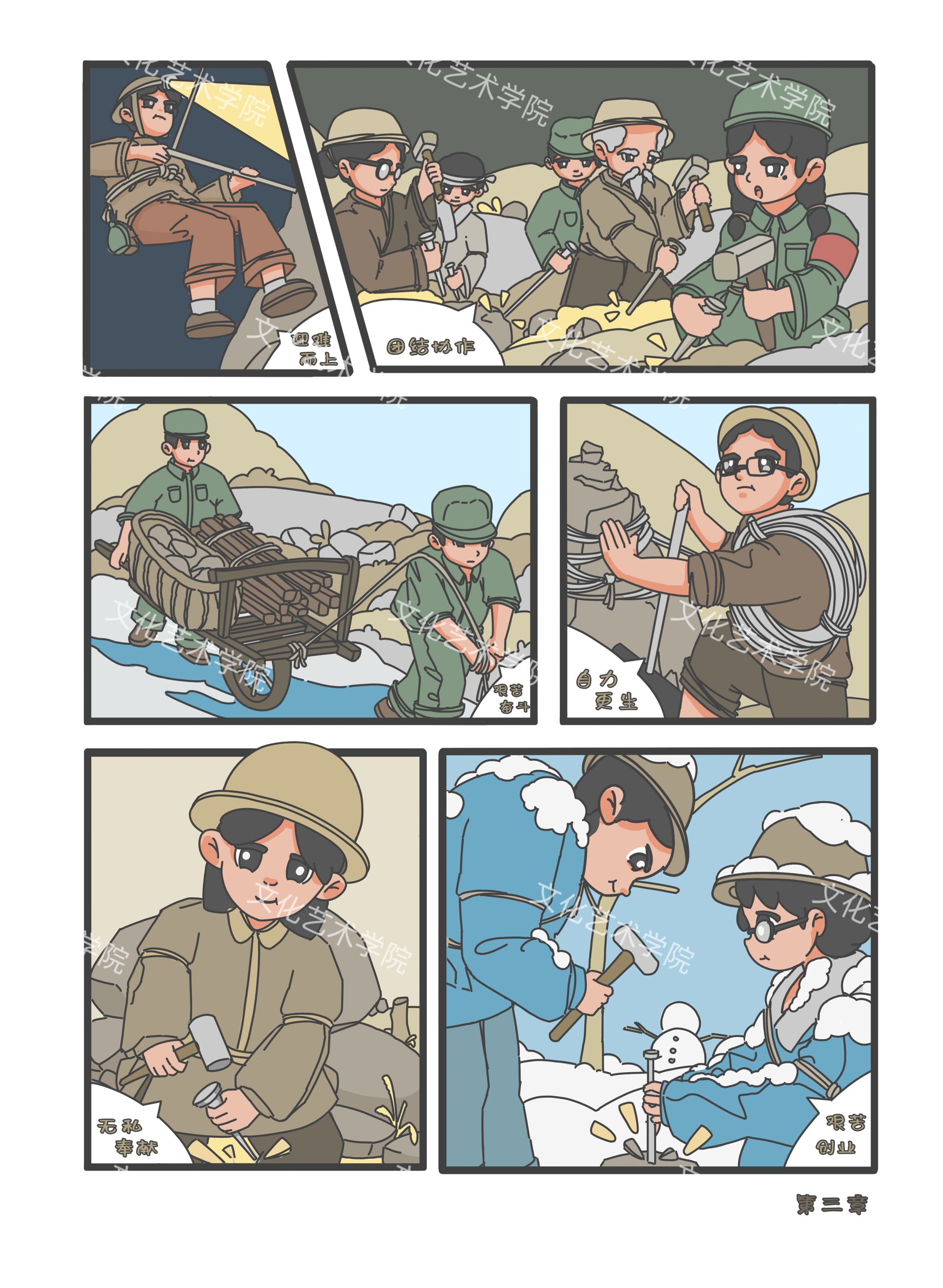 这组红旗渠故事的漫画创作是一面旗帜,在教育和艺术的道路上指引前行的方向,激发每一个学子发掘内心的潜能,传承和发扬着这份宝贵的精神财富。