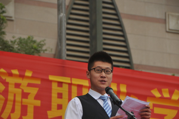 开学典礼在奏唱国歌升国旗中开始。教师代表旅游外语系主任张贺玲老师、学生代表2014级旅游管理系张鑫睿同学、新生代表2015级经济贸易系王鑫同学、军训教官代表河南省武警总队直属支队郭海明中尉先后发言,分别为2015级新生送上祝福与鼓励。