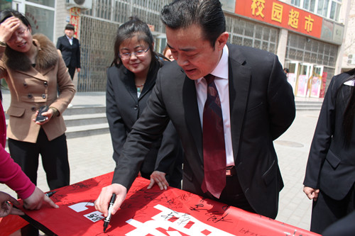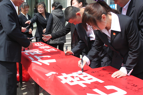活动过程中,前往教工食堂就餐的院长樊豫陇教授也来到了现场。他在即席讲话中要求:教室做到不点长明灯,水房做到不开长流水,餐厅做到不剩一粒米。他号召全院师生行动起来,争做节俭的实践者、示范者和传播者,发挥一种正能量,为构建节能、环保的校园环境做出自己的贡献。最后,樊院长在宣传条幅上郑重地签下了他的名字。