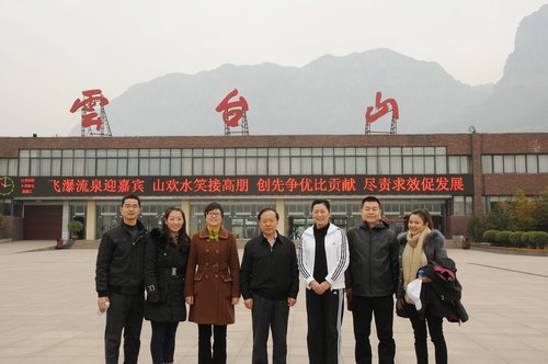 大连外国语学院党委书记柳振万(中)在我院党委书记岳俊华(右三)陪同下考察云台山景区