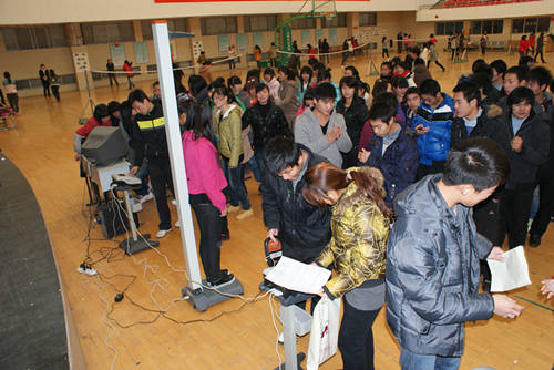 我院艺体部的体育和艺术教研室从2011年11月下旬开始,对全院近3000名在校生(非毕业班学生)进行了《国家学生体质健康标准》测试。体质健康标准测试项目包括:身高、体重、肺活量、握力、台阶试验、坐位体前屈、立定跳远。