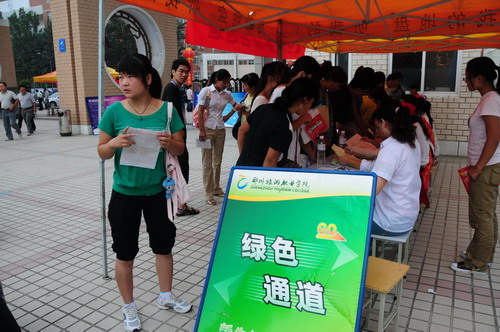 新生报到区域集中在办公楼前面的喷泉广场,标有各系名称的迎新棚沿两侧顺次排开,新生注册、缴费、报到、办理餐卡等等手续有条不紊的进行着。在各系迎新点,老师和同学们用亲切的笑容欢迎新生,并耐心回答他们的问题。新生入学绿色通道处,家庭经济困难的同学可以通过助学贷款服务,及时办理入学手续,确保不让一名学生因为家庭困难失学。