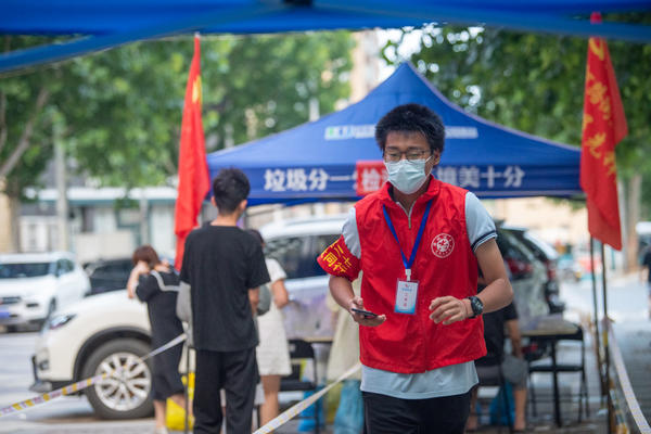 8月7日,封控区内开始第三轮核酸检测,在淮河路街道陇海社区的检测点,张宁拿着手机对前来检测的居民进行扫码登记。一遍遍核对信息,维持排队秩序,市民在他的引导下有序开始检测。