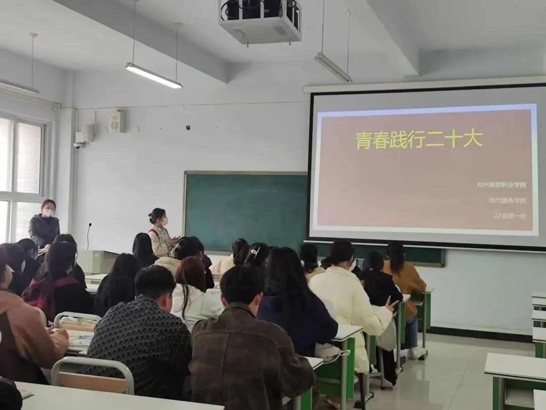 为深入学习宣传贯彻党的二十大精神,坚持聚焦立德树人根本任务,厚植爱党爱国爱社会主义情怀,引导学院学子从学习过程中汲取奋进力量。现代服务学院各班学生于2023年3月20日于1A教学楼开展“青春践行二十大”主题班会。