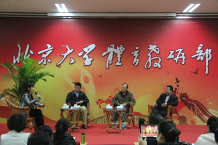 同时,论坛还展开了两场“强强对话”。北大人文体育基地副主任董进霞教授主持了“体育与中国梦”高层对话。田径著名教练,“飞人”刘翔的教练孙海平,国家女子跆拳道队总教练、奥运冠军陈中教练卢秀栋,中国男子花剑奥运冠军雷声的教练王海滨等三位“明星教头”分别从自身的角度分享了他们的体育梦、中国梦;在从运动员到教练的转型过程中,他们不断借鉴、学习、摸索、创新,制定了行之有效的训练方法和训练理念,通过科学的训练、文化的熏陶、逆境的调试等打造“冠军神话”,解密“冠军是如何养成的”;最后,三位冠军教练卢秀栋、孙海平、王海滨分别以一句话“体育与中国梦,相伴我一生”、“坚持不懈,坚持到底”、“体育与中国梦是我执著的源泉”,精炼地概括了体育与中国梦的主题。第二场高层对话由北京大学体育部书记张锐教授主持,女子速滑名将、世界冠军叶乔波,两届奥运冠军、现就读于北大的体操名将邓琳琳,清华大学跳水队总教练于芬,广东省体育局副局长高敬萍就“女性与中国梦”的话题展开讨论。几位女性分别就自己如何与体育结缘等向在场的嘉宾娓娓道来。在面对伤病、挫折、退役等挑战时,她们纷纷“华丽转身”,在政界、商界、学术界顺利实现转型,并在已经成功的道路上继续追逐目标,永不言败,成为女性运动员退役“再就业”的典范与楷模。最后,她们也分别以一句话祝愿在场的女性圆梦人生,“美好是属于自信者的,机会是属于开拓者的,奇迹是属于执著者的”,“成功的路上并不拥堵,因为坚持的人不多”等博得了在场嘉宾的阵阵掌声。