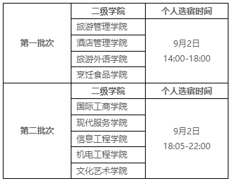 时间:9月2日14:00-22:00时分两批开放网上选宿功能;8月31日12:00前完成网上交费的新生可通过网上选宿功能自行选宿;9月5日22:00分之前完成缴费,且未进行个人选宿的新生,由宿管系统自动分配宿舍和床位,其他新生在现场报到当天进行现场分配宿舍。