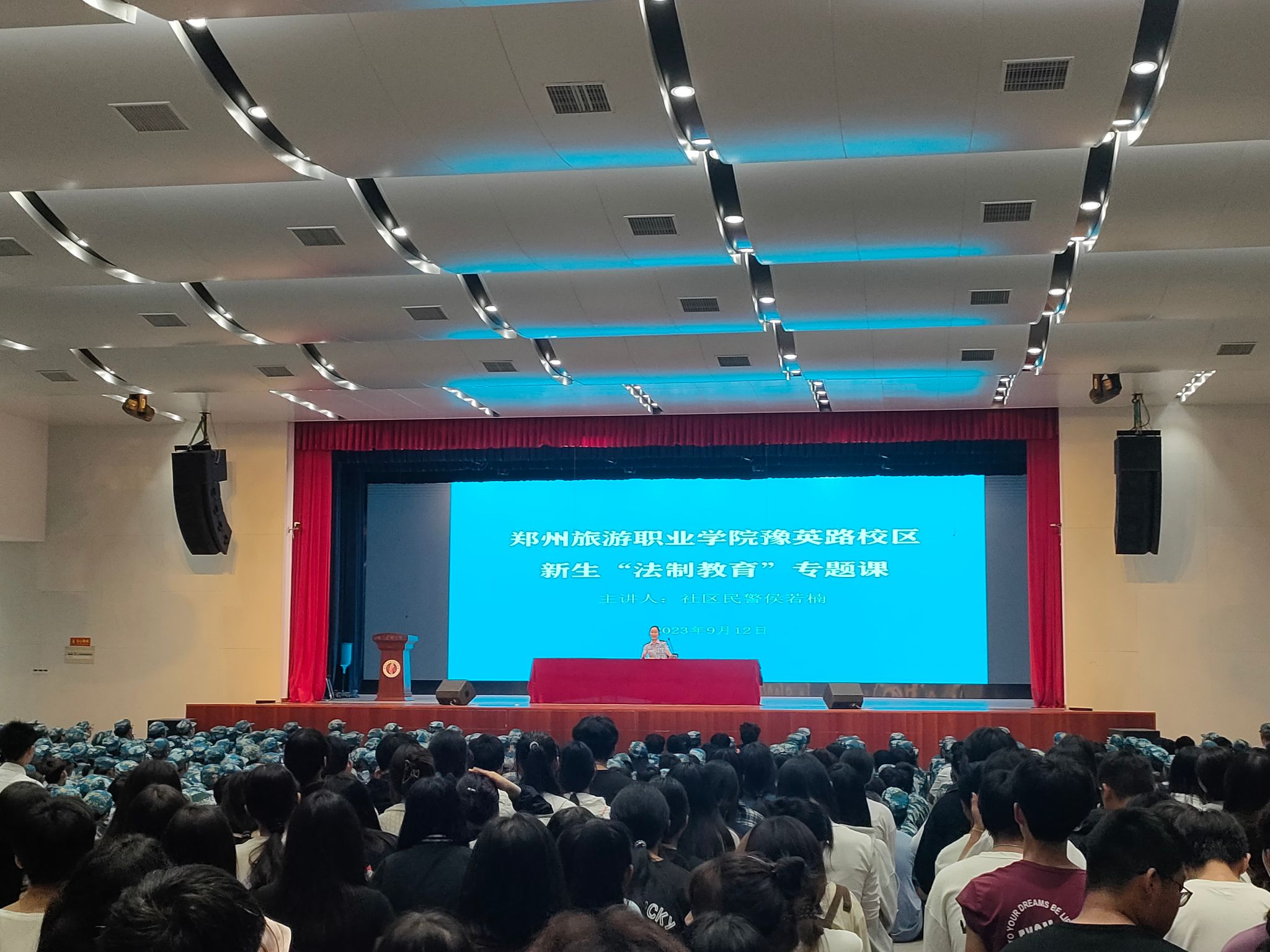 为深入贯彻习近平法治思想,引导广大师生提高法制意识,远离违法犯罪,努力营造校园“学法、懂法、守法”的良好氛围,提高自我保护能力,近日,海洋之神590登录入口安全保卫中心诚邀航海东路派出所民警侯若楠警官到豫英路校区为2022和2023级学生共900余人进行法制教育专题讲座。老校区负责人周鹏、安全保卫中心治安科科长代慧峰、团委刘嘉佳等相关人员参加出席。