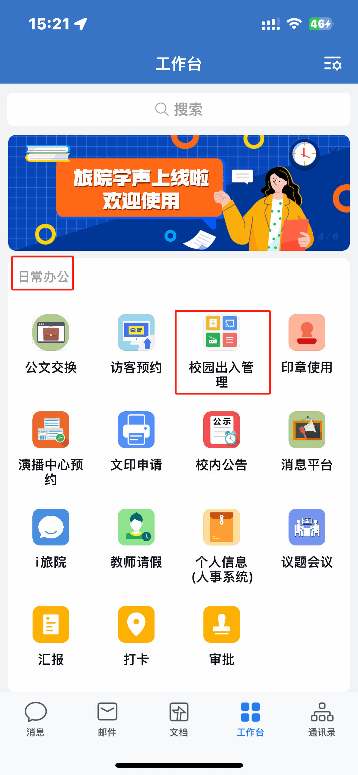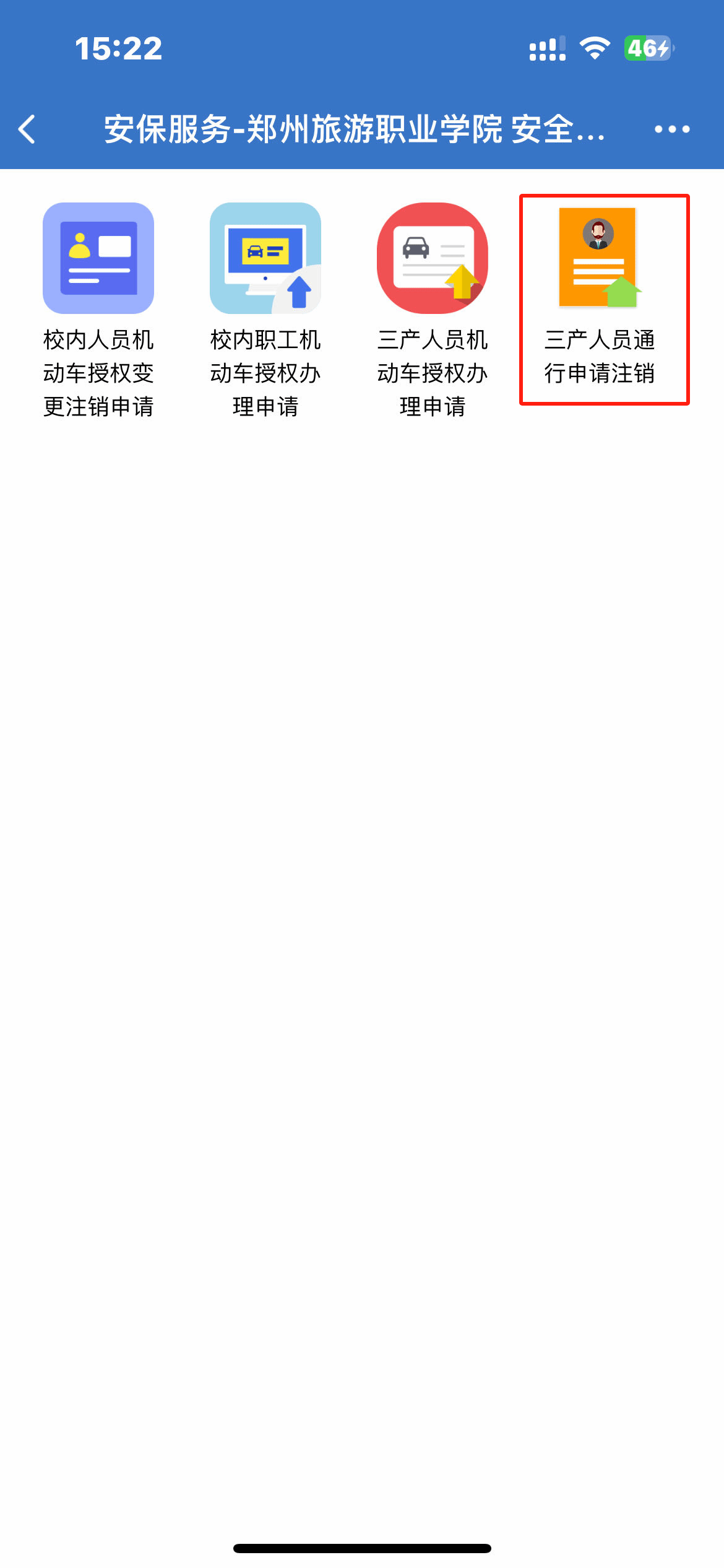 1.打开企业微信APP,在“工作台”—日常办公栏点击“校园出入管理”文件夹—点击【三产人员通行申请注销】进入;