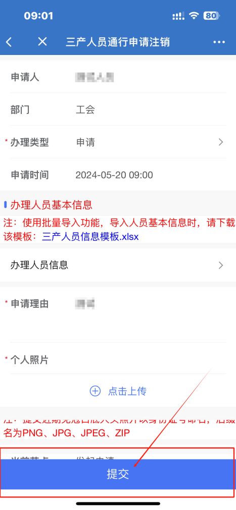 2.打开【三产人员通行申请注销】服务,点击“发起申请”,进入后,按照表单要求填写信息,最后点击“提交”。(如办理人员较多,可点击下载“三产人员信息模板”填写后导入,“离职时间”一栏在办理申请业务时不填,在办理注销业务时为必填项)