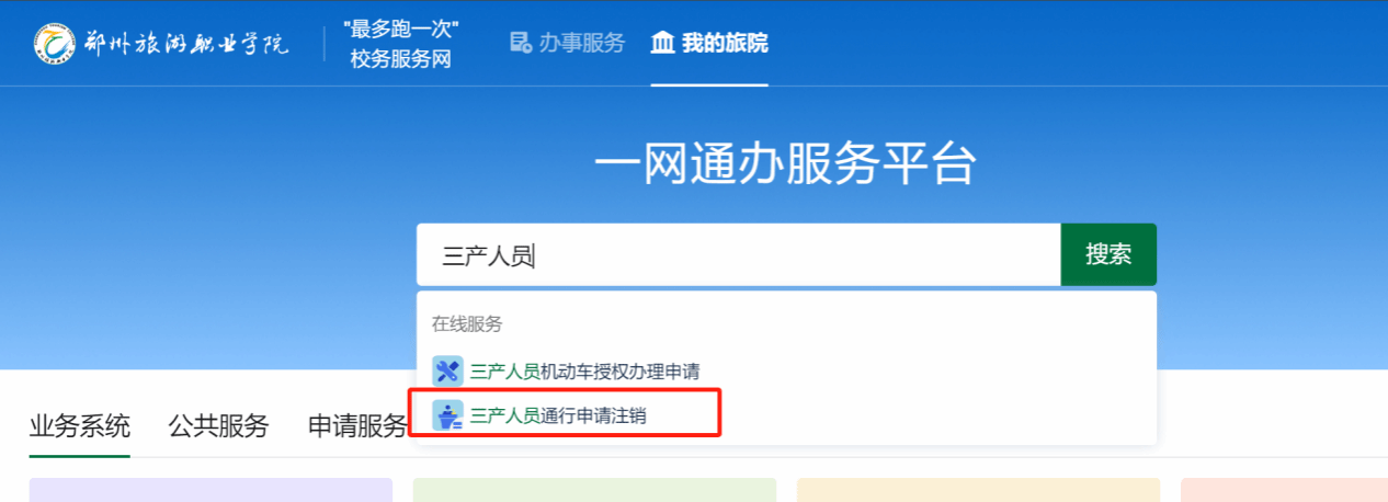 1. 登录一网通办平台,(http://i.zztrc.edu.cn)后,在搜索框搜索【三产人员通行申请注销】关键字,在列出的服务列表点击进入。