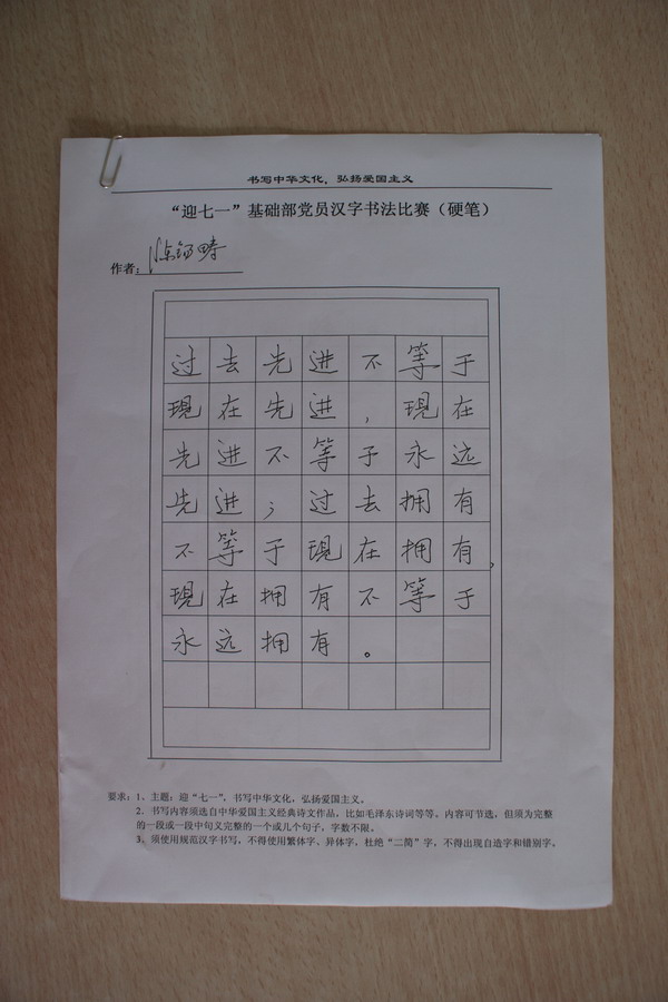 书法比赛主题是:迎“七一”,书写中华文化,弘扬爱国主义精神。参加人员以支部党员为主,比赛作品主要是硬笔书法,内容大多选自中华爱国主义经典诗文作品,字体风格多样,精彩纷呈,有不少优秀的作品。作为支部成员,陈锡畴院长也认真准备了优秀的书法作品,支持这次比赛。活动中共收到作品32份,经过专家评审,共评出特别奖1名,一等奖3名,二等奖6名,三等奖23名。