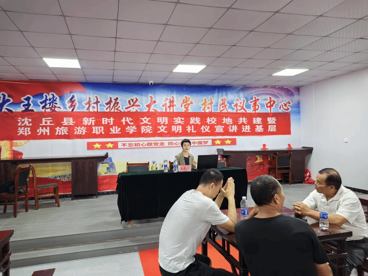 2023年6月29日,公共教学部礼仪教研室王建华副教授积极响应学校号召,不顾身体不适,带病前往沈丘县槐店镇,为村民们宣讲文明礼仪基础知识。这次讲座在刚建成的槐店镇大王楼行政村村民议事厅举行,尽管天气炎热,但村民们依然聚精会神、认真听讲。