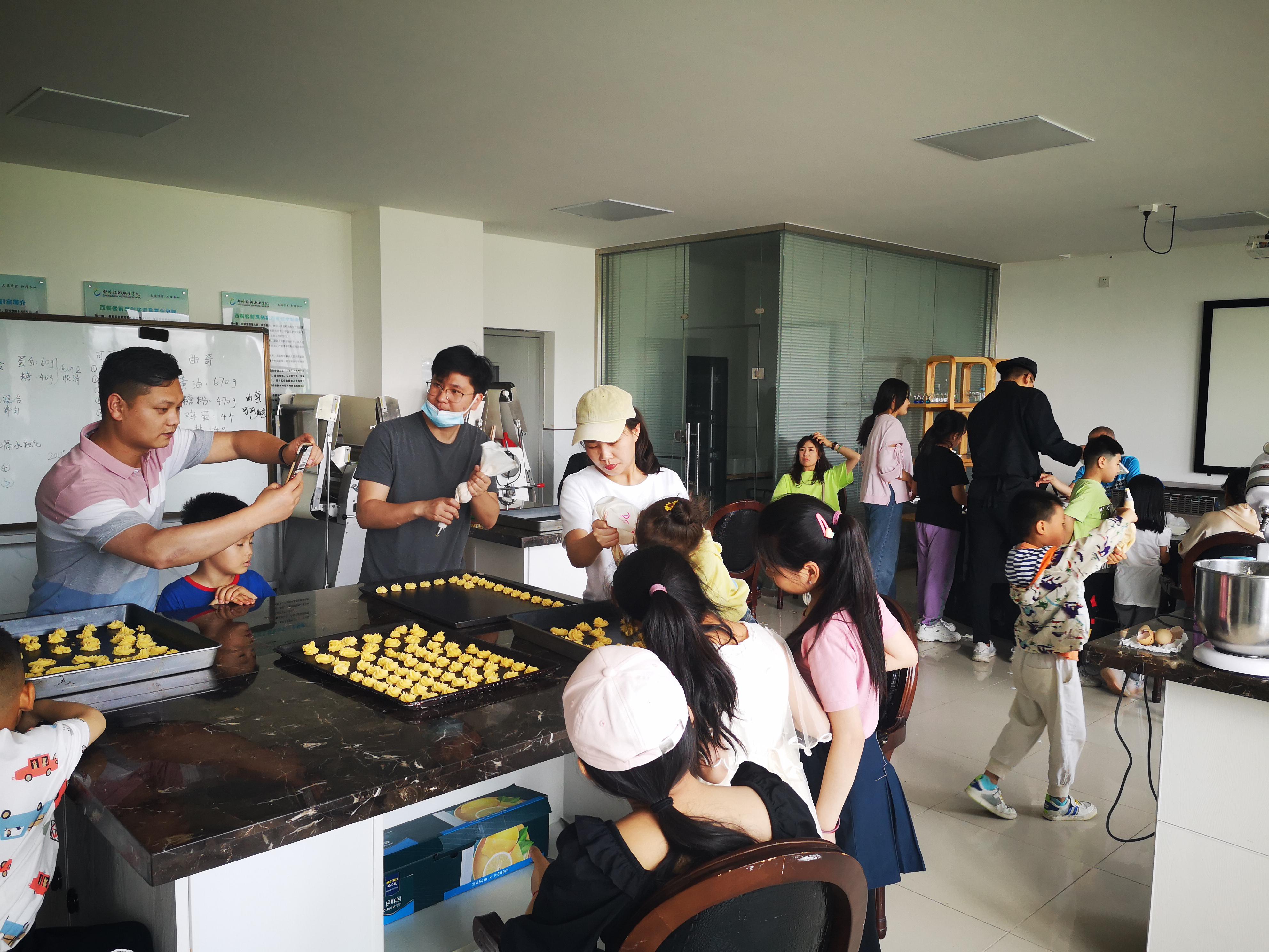 随后教职工们和子女自行返回学校,在学校酒店管理学院西点实训室开展手工制作曲奇和蛋挞活动,教职工和子女们都认真的听取老师的讲解,亲手参与制作。