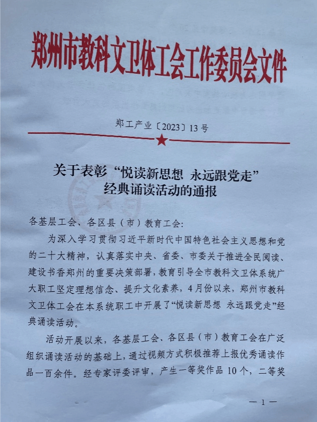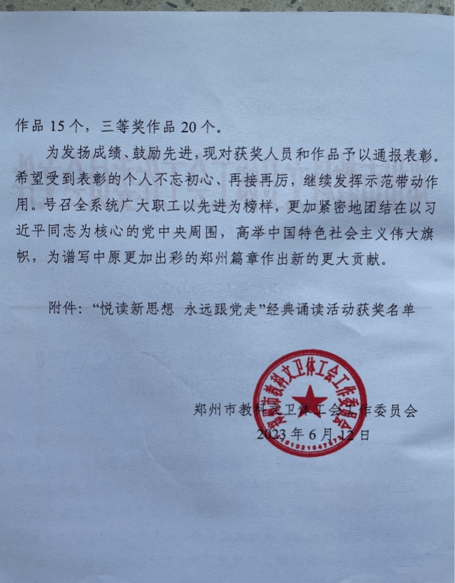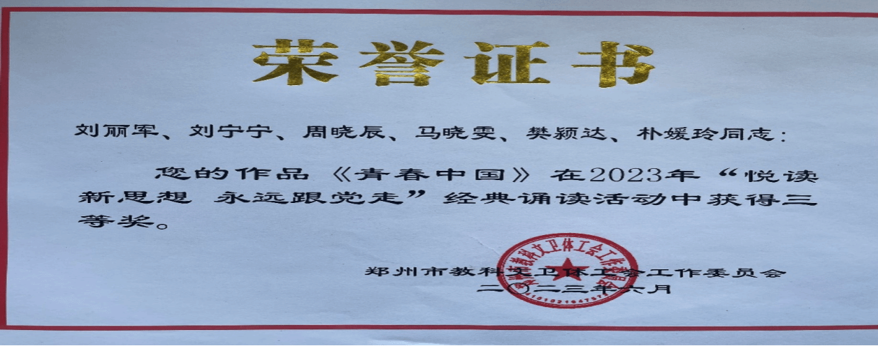 近日,郑州市教科文卫体工会印发《关于表彰"悦读新思想 永远跟党走"经典诵读活动的通报》。我院选送的由刘丽军、刘宁宁、周晓辰、马晓雯、樊颖达、朴媛玲诵读的作品《青春中国》荣获三等奖。