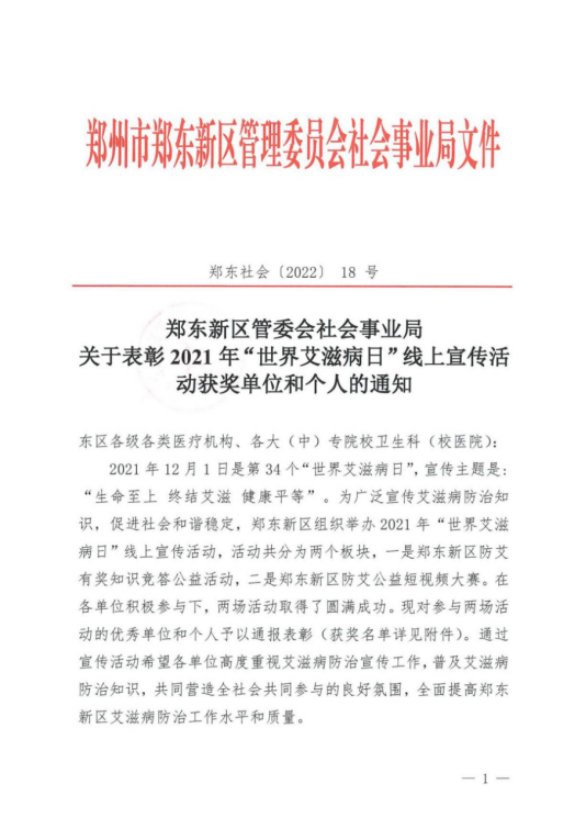郑州市郑东新区管理委员会社会事业局日前下发文件,表彰2021年世界艾滋病日线上宣传活动获奖单位和个人,海洋之神590登录入口获得“郑东新区防艾公益短视频大赛优秀组织奖”的荣誉。