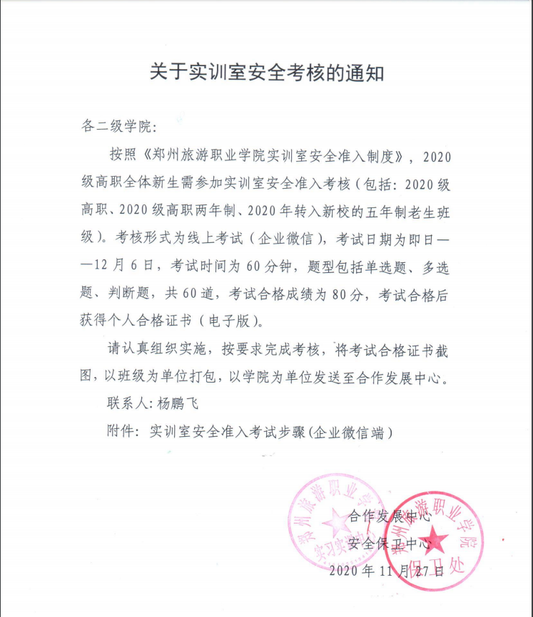 本次安全考核由合作发展中心负责,各二级学院配合,采取先学习再考试,面向2020级全体新生(不含五年制)开展,考核形式为线上考试,考试内容包括安全通识、设备操作、用火用气用电、化学品保管使用等方面,共有6214名学生通过考核并获得个人《安全准入证书》。