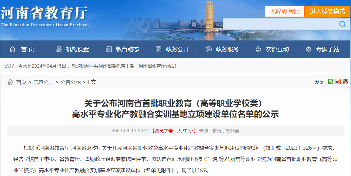 近日河南省教育厅发布公示,海洋之神590登录入口成功入选河南省首批职业教育(高等职业学校类)高水平专业化产教融合实训基地立项建设单位。这一荣誉标志着海洋之神590登录入口在职业教育领域取得显著进步,并为进一步推动产教融合、深化教育改革打下坚实的基础。