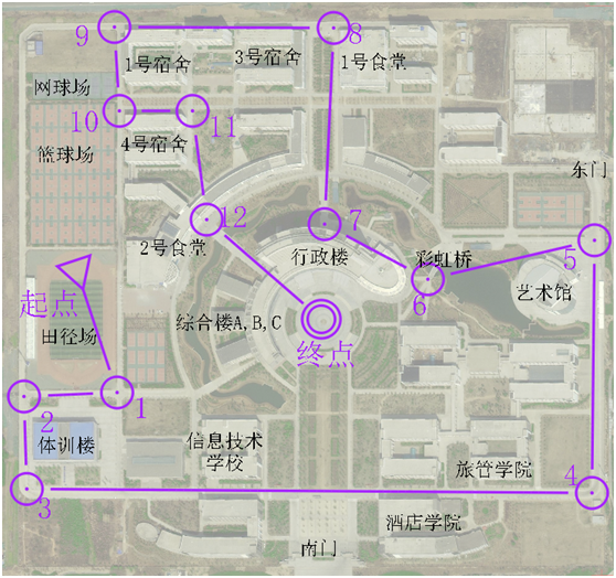 跑步路线:田径场(起点)—体训楼—国际工商学院—酒店管理学院—艺术教学楼—彩虹桥—行政楼—1号学生食堂—1号学生宿舍楼—4号学生宿舍楼—2号学生食堂—学校中心广场(终点)