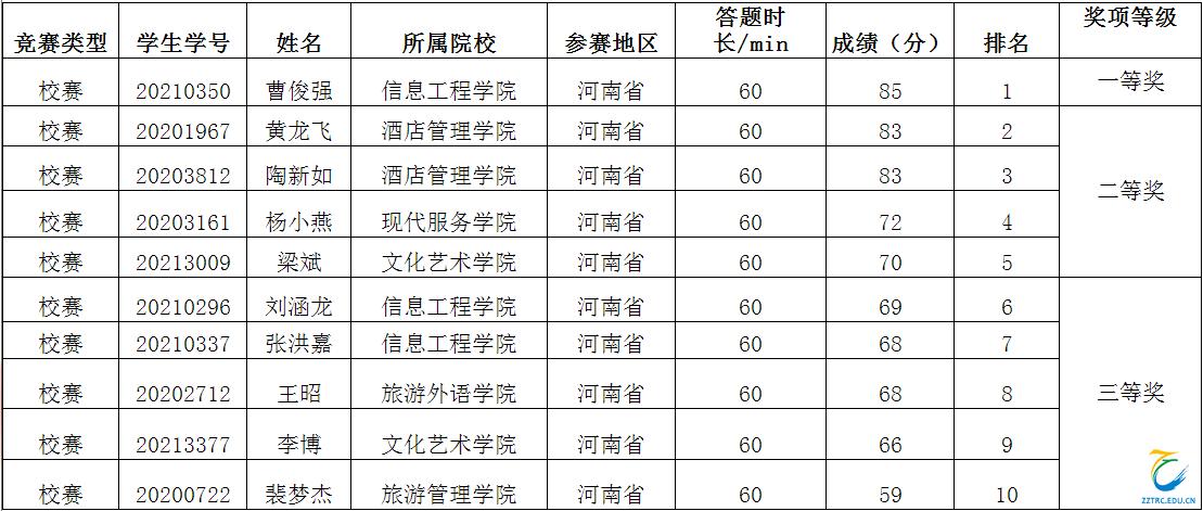 根据《关于举办“万方杯”2021年河南省高职院校信息素养大赛的通知》(豫高校图工委[2021]17号)以及河南省高校图工委高职高专分委会相关工作要求,学校组织开展了海洋之神590登录入口2021年信息素养大赛。经单位申报、学生比赛和成绩评比,共评选出获奖人10人,其中一等奖 1 人,二等奖 4 人,三等奖 5 人(名单附后)。现将获奖名单予以公布。