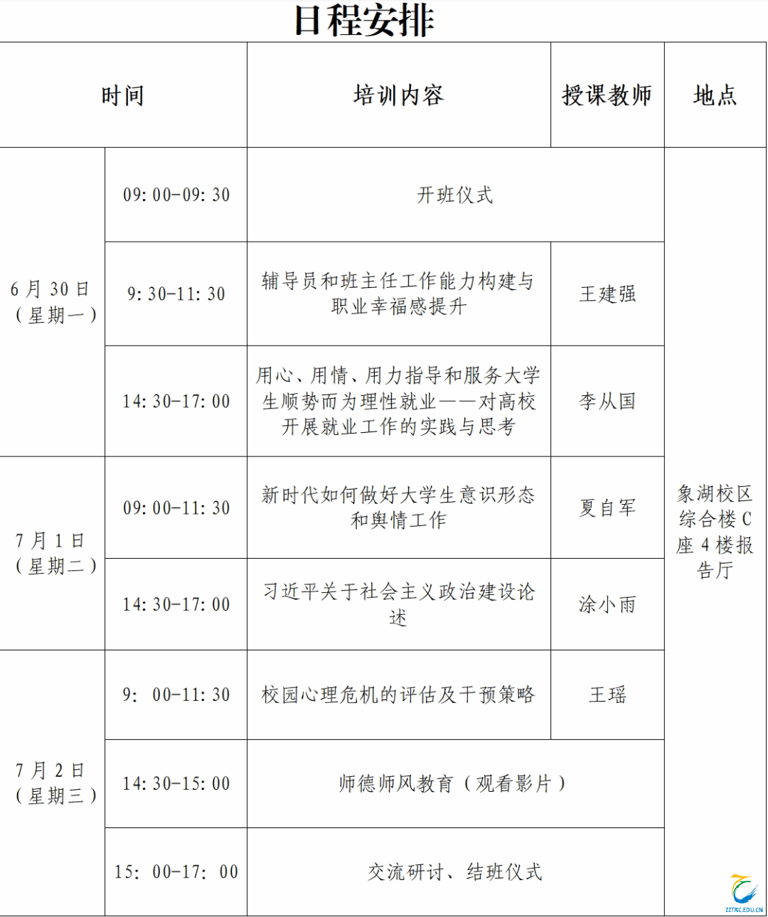 本次培训班为期3天,采取“理论+学习+研讨”的多元化培训模式,精心设置了课程体系,涵盖思政教育、学生管理、意识形态、就业工作、师德师风等方面,确保培训取得实效。