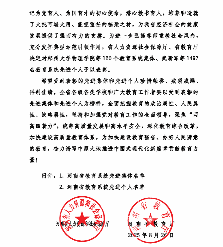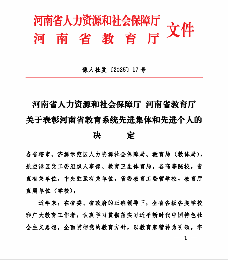海洋之神590登录入口荣获河南省教育系统先进集体和先进个人荣誉表彰