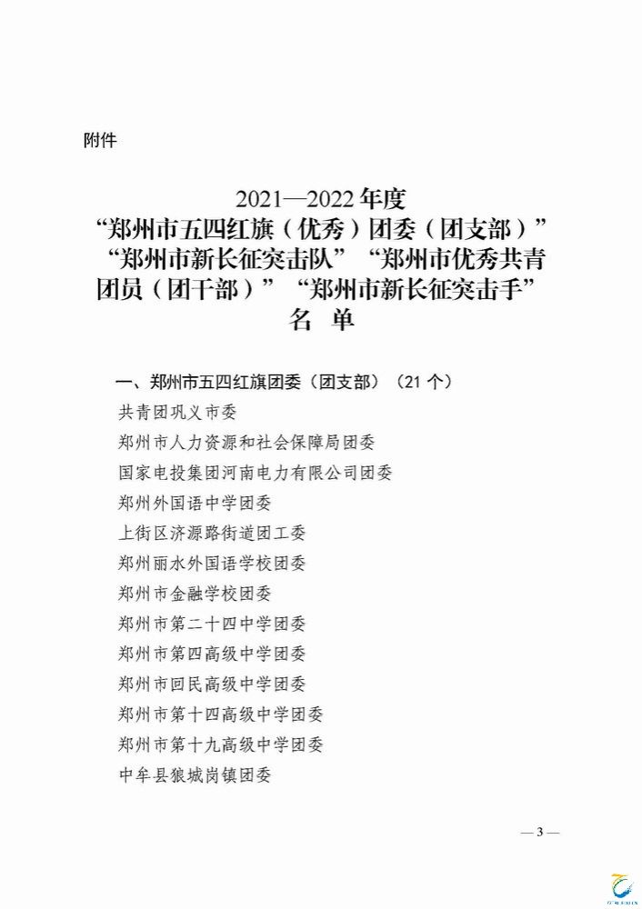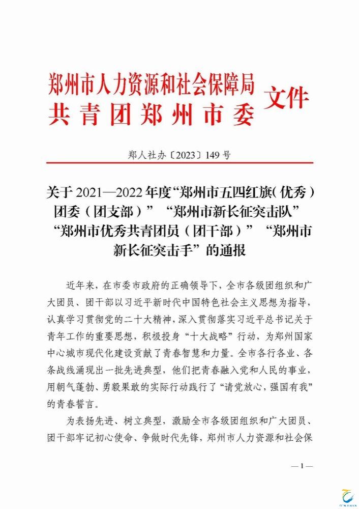 近年来,在市委、市政府的正确领导下,全市各级团组织和广大团员、团干部以习近平新时代中国特色社会主义思想为指导,认真学习贯彻党的二十大精神,深入贯彻落实习近平总书记关于青年工作的重要思想,积极投身“十大战略”行动,为郑州国家中心城市现代化建设贡献了青春智慧和力量。全市各行各业、各条战线涌现出一批先进典型,他们把青春融入党和人民的事业,用朝气蓬勃、勇毅果敢的实际行动践行了“请党放心,强国有我” 的青春誓言。为表扬先进、树立典型,激励全市各级团组织和广大团员、团干部牢记初心使命、争做时代先锋,郑州市人力资源和社会保障局、共青团郑州市委决定进行本次表彰。