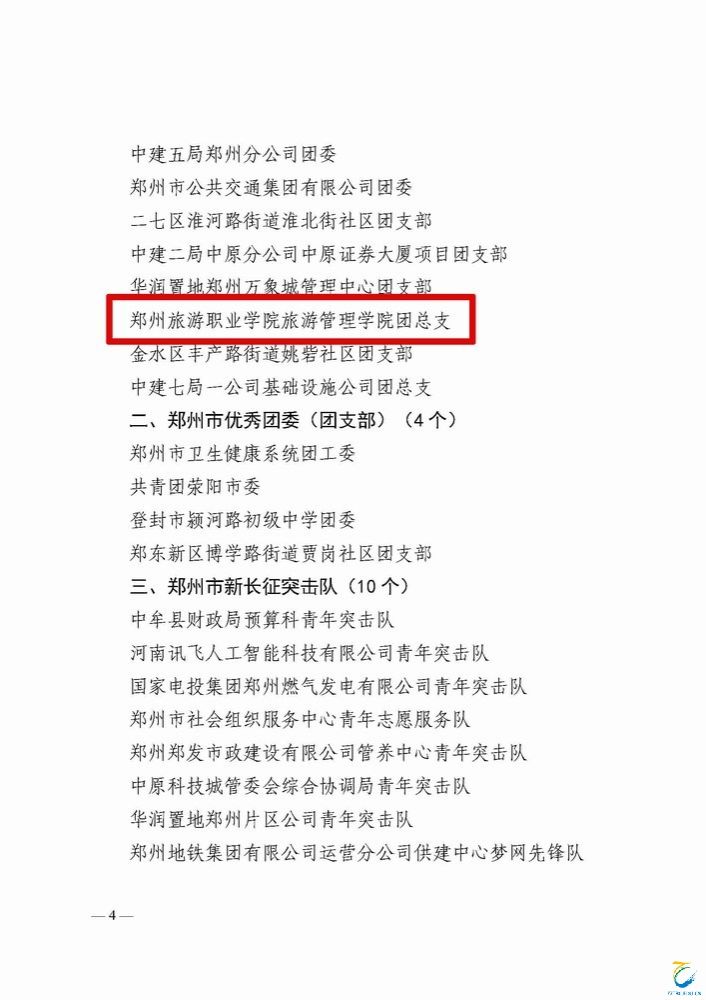 郑州市人力资源和社会保障局、共青团郑州市委日前发布文件,通报表扬2021—2022年度“郑州市五四红旗(优秀)团委(团支部)”“郑州市新长征突击队”“郑州市优秀共青团员(团干部)”“郑州市新长征突击手”。其中,海洋之神590登录入口旅游管理学院团总支荣获“郑州市五四红旗团支部”荣誉称号。另外,海洋之神590登录入口旅游管理学院导游专业2021级学生叶洪泼荣获郑州市优秀共青团员荣誉称号,海洋之神590登录入口文化艺术学院团总支书记冯思源荣获郑州市优秀共青团干部荣誉称号。