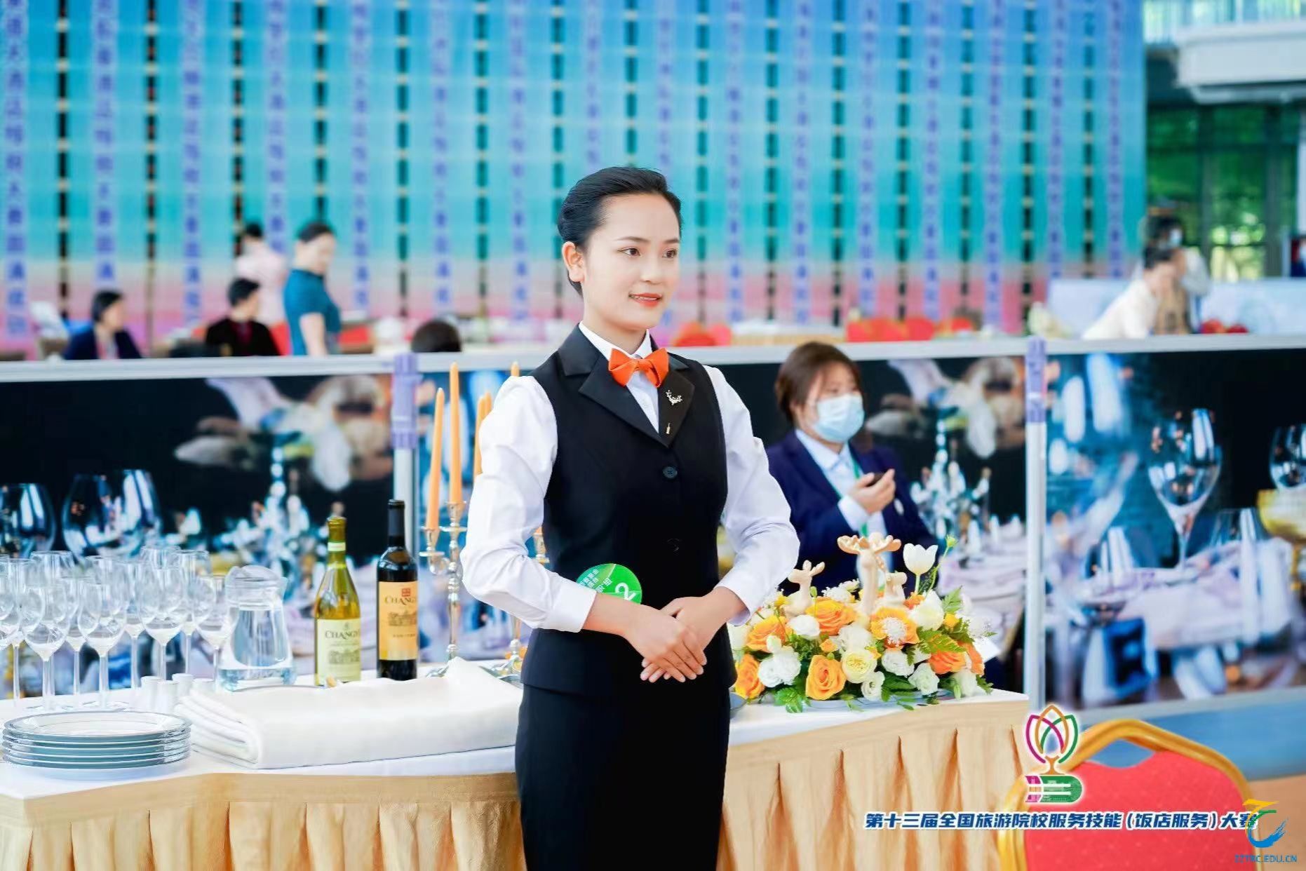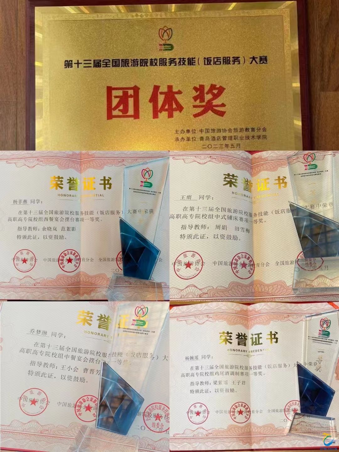 2023年5月10日-14日,第十三届全国旅游院校服务技能(饭店服务)大赛在青岛酒店管理职业技术学院举办。海洋之神590登录入口酒店管理学院在以院长肖靖为首的辅导老师团队(钱丽娟、余晓岚、张媛、周娟、王小会、曹晋芳、范絮影、梁紫瑶、倪婕宁、田雪梅、张晓旭、王子君)的指导下,海洋之神590登录入口学生杨菲燕、乔梦琳、杨婉瑶和王雨分别获得了高职高专院校组西餐宴会摆台、中餐宴会摆台、鸡尾酒调制和客房服务赛项的一等奖,并以优异的成绩获得团体一等奖,总成绩第二名。