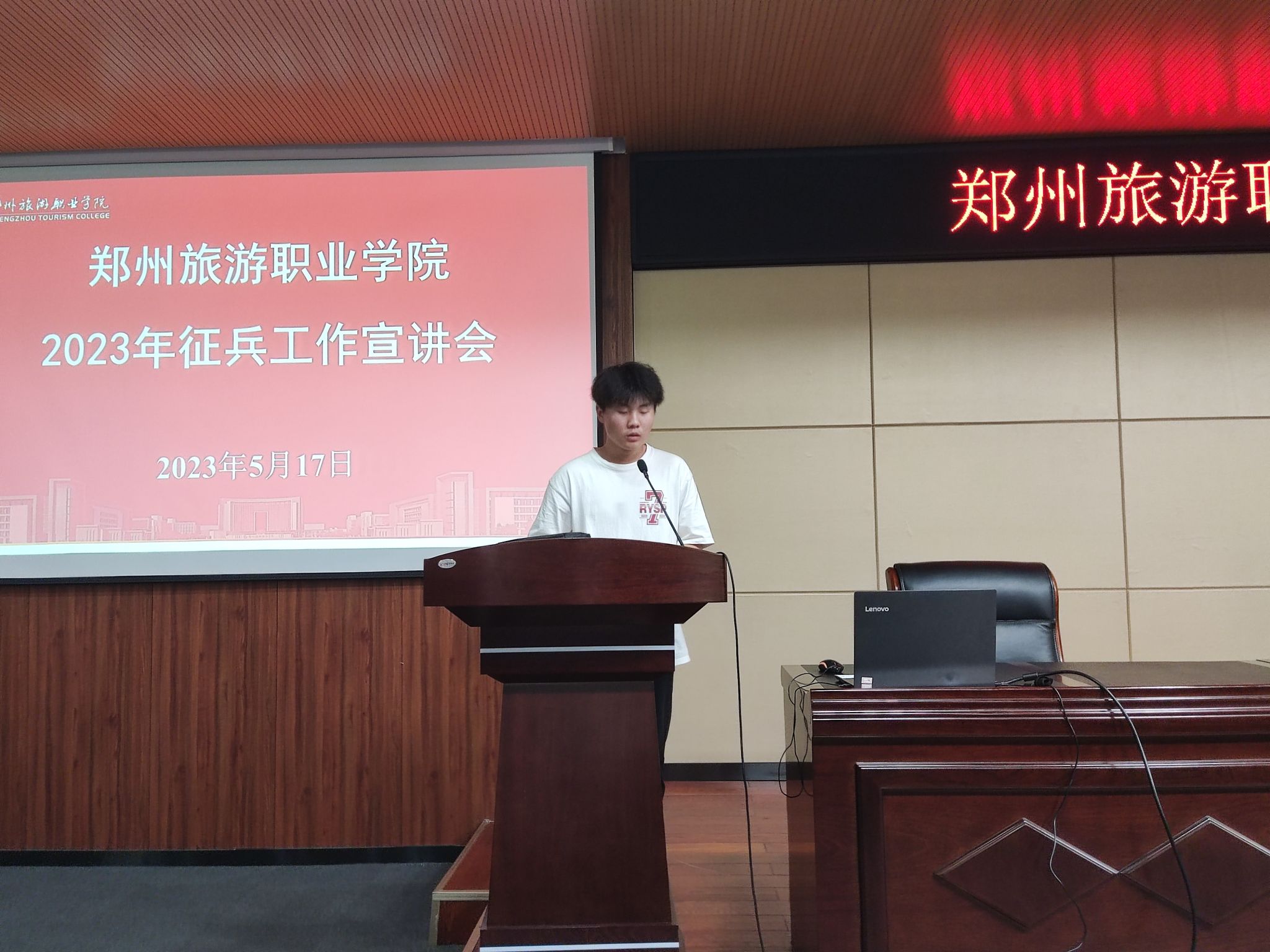 会议第一项,由应征报名青年代表朱炳宇上台发言,他代表全体意向参军的旅院学子向大家表达了应征青年立志从军报国的壮志豪情和对军旅生活的向往,字里行间都体现了对军人这个崇高称谓的深深向往和时刻准备献身国防事业的决心誓言。