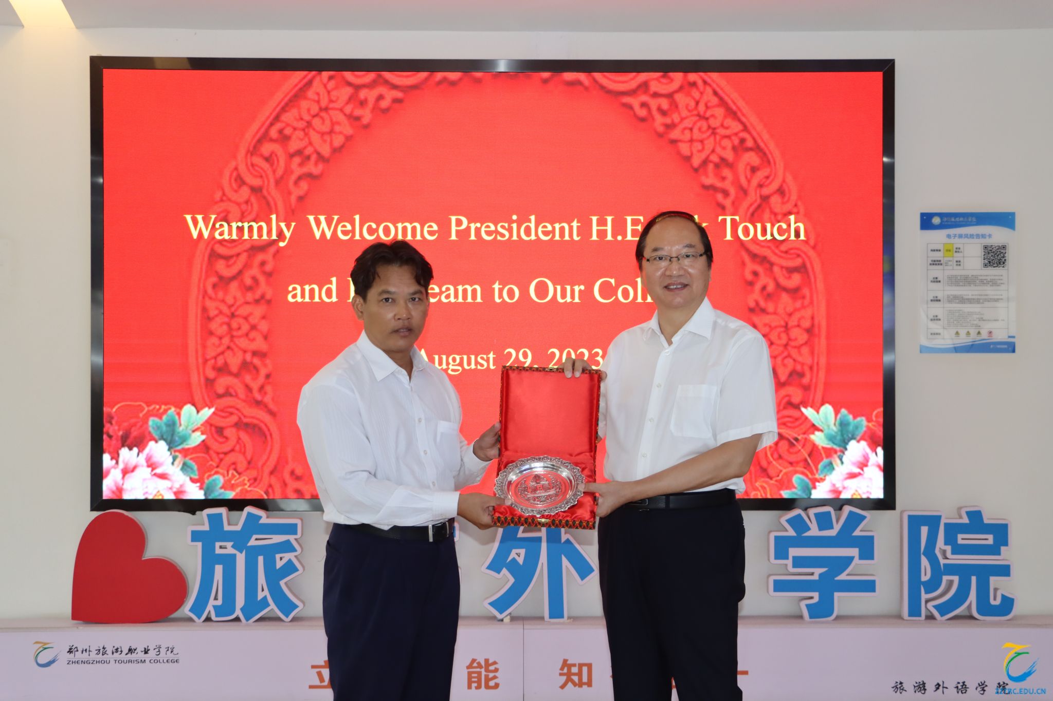 8月29日上午,在郑州市委副秘书长、政研室主任严波等陪同下,柬埔寨皇家科学院宋独院长率代表团一行6人到海洋之神590登录入口参观交流,校长文广轩、副校长徐永清会见了宋独院长一行。